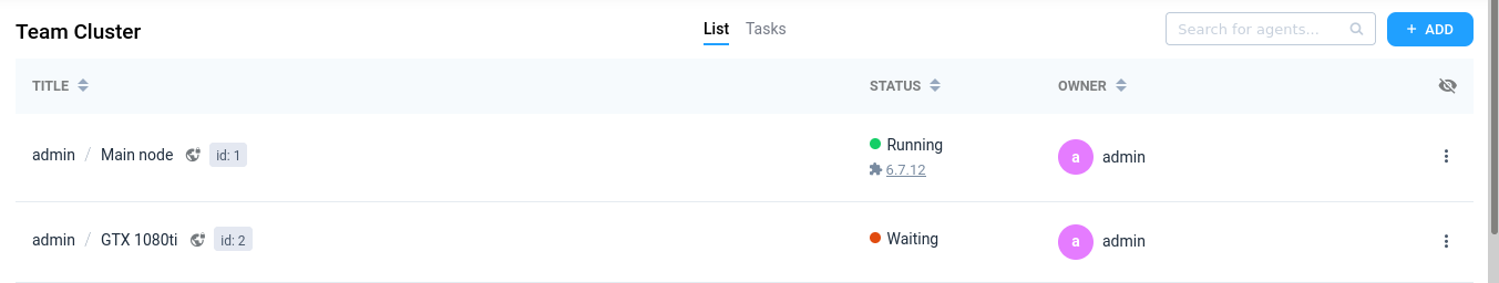 Now you should see your node in the dashboard with the status "Running". It means that you can run tasks on that agent. You can click on the node name (generated automatically) to see the hardware info, "htop" and "nvidia-smi" (if available) commands output and other system information for node's health monitoring.
