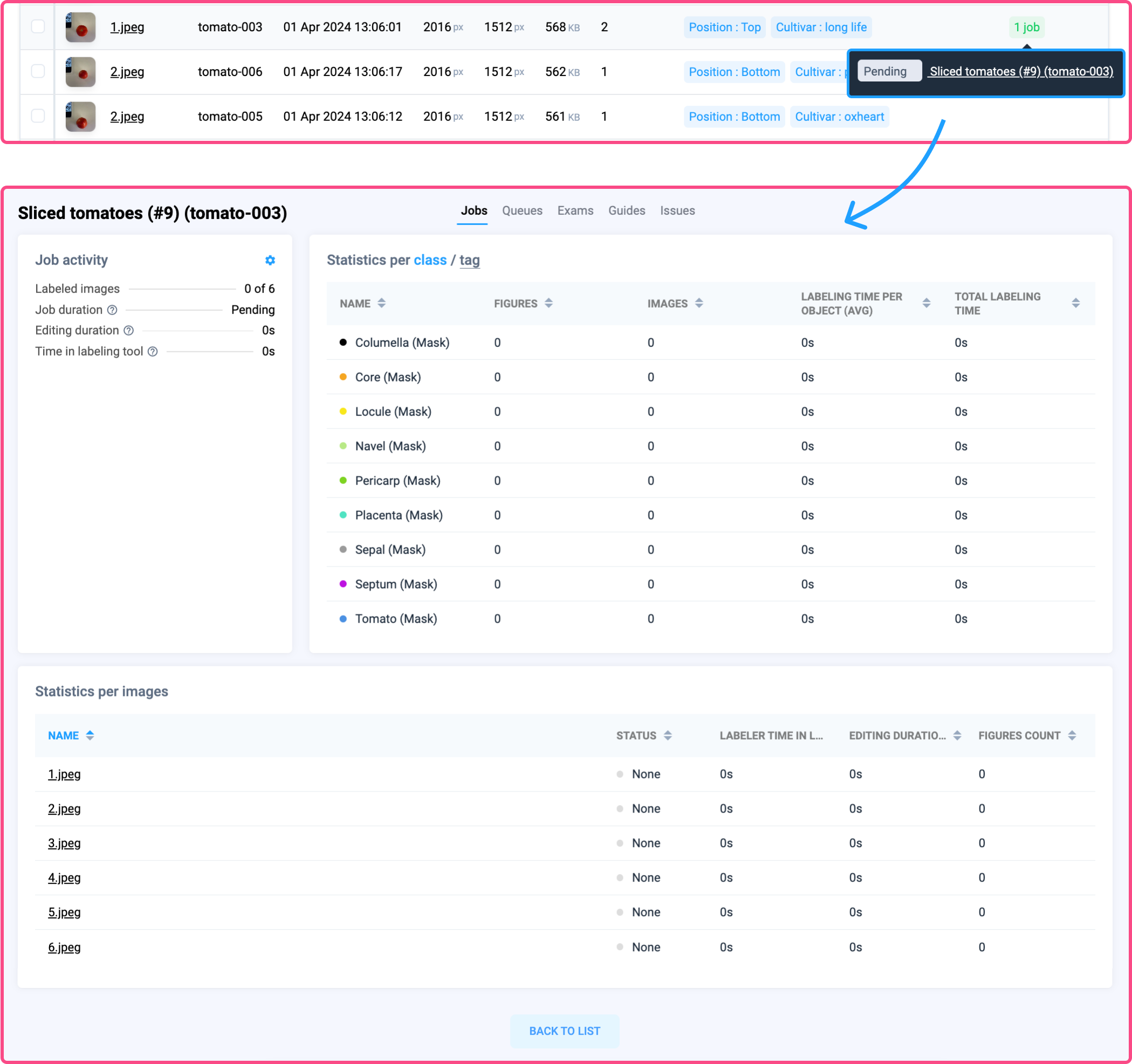 Users can easily view the status of each image within a labeling job, simplifying the monitoring of annotation progress. By clicking on the status of a labeling job, users can access statistics on job activity, labeling time per object, and total labeling time. Detailed statistics are available for individual images, including labeler time in the tool, editing durations, and object counts. This comprehensive information ensures thorough tracking and analysis of the annotation process, enabling managers to accurately assess their annotation workflow.