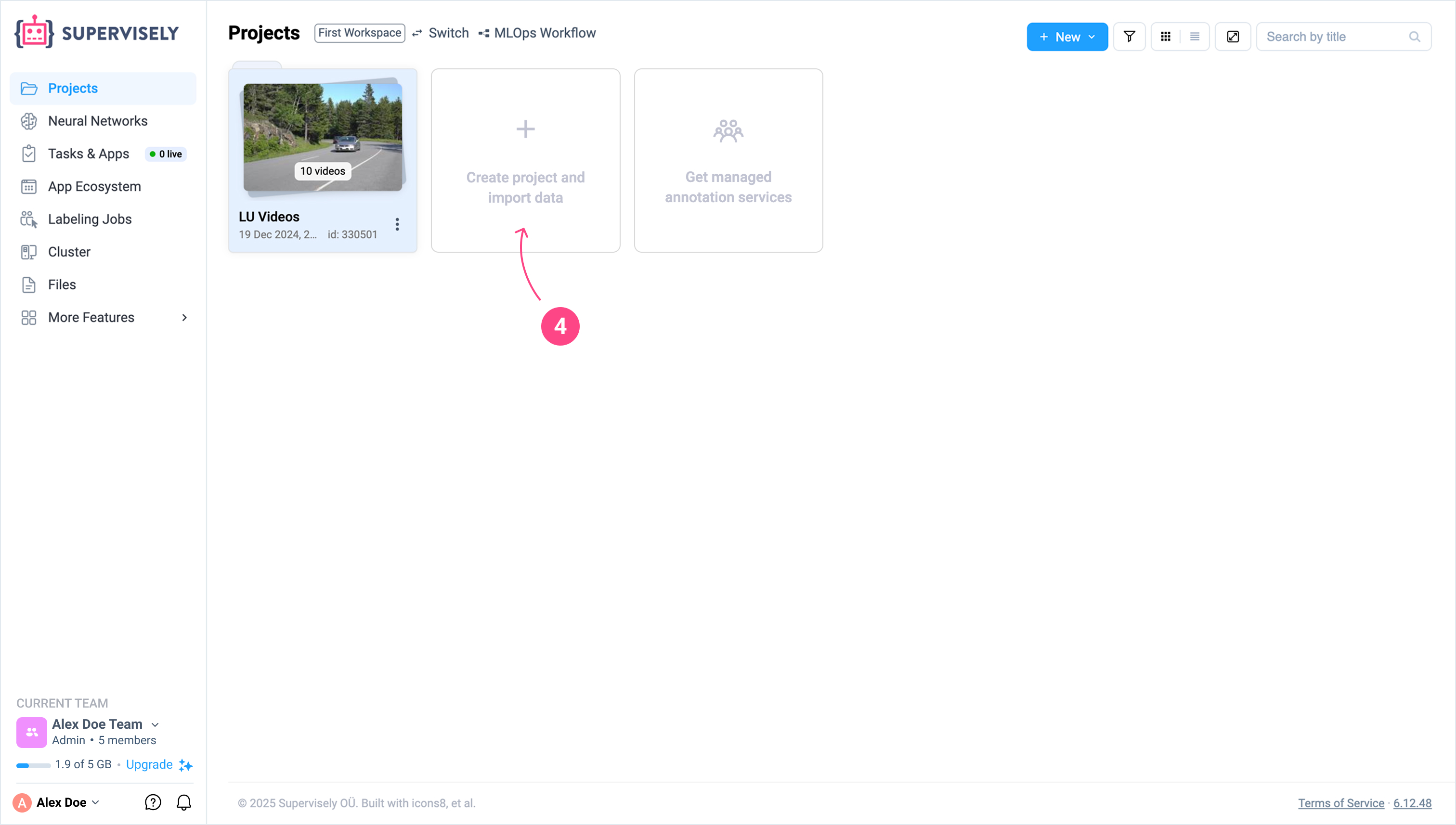 4. To create another project to the existing ones, simply click on the section with “+” and the text “Create project and import data” next to the folder of the created project.