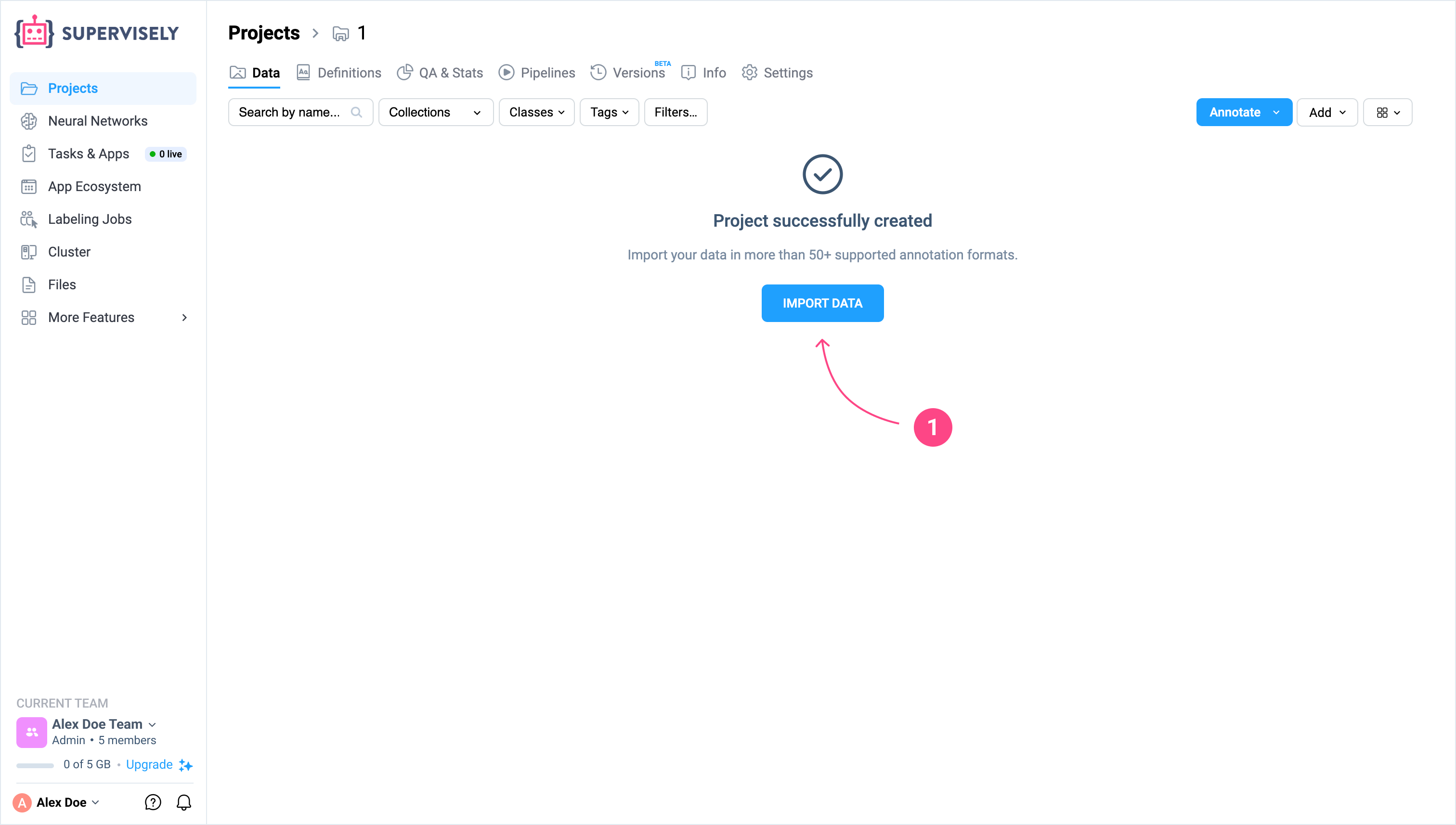 1. To create your first project in the current Team and workspace, click the “Import Data” button.