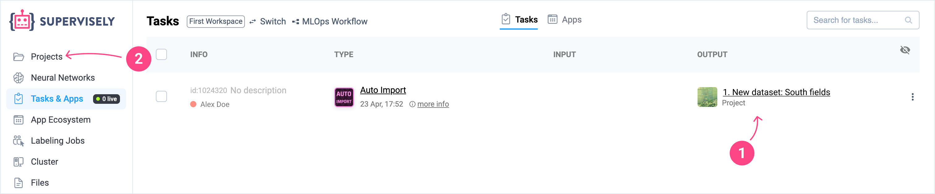 You can then go to your **Dataset** by clicking the link (1) in the task card or by navigating to it through the **Main Menu** (2).