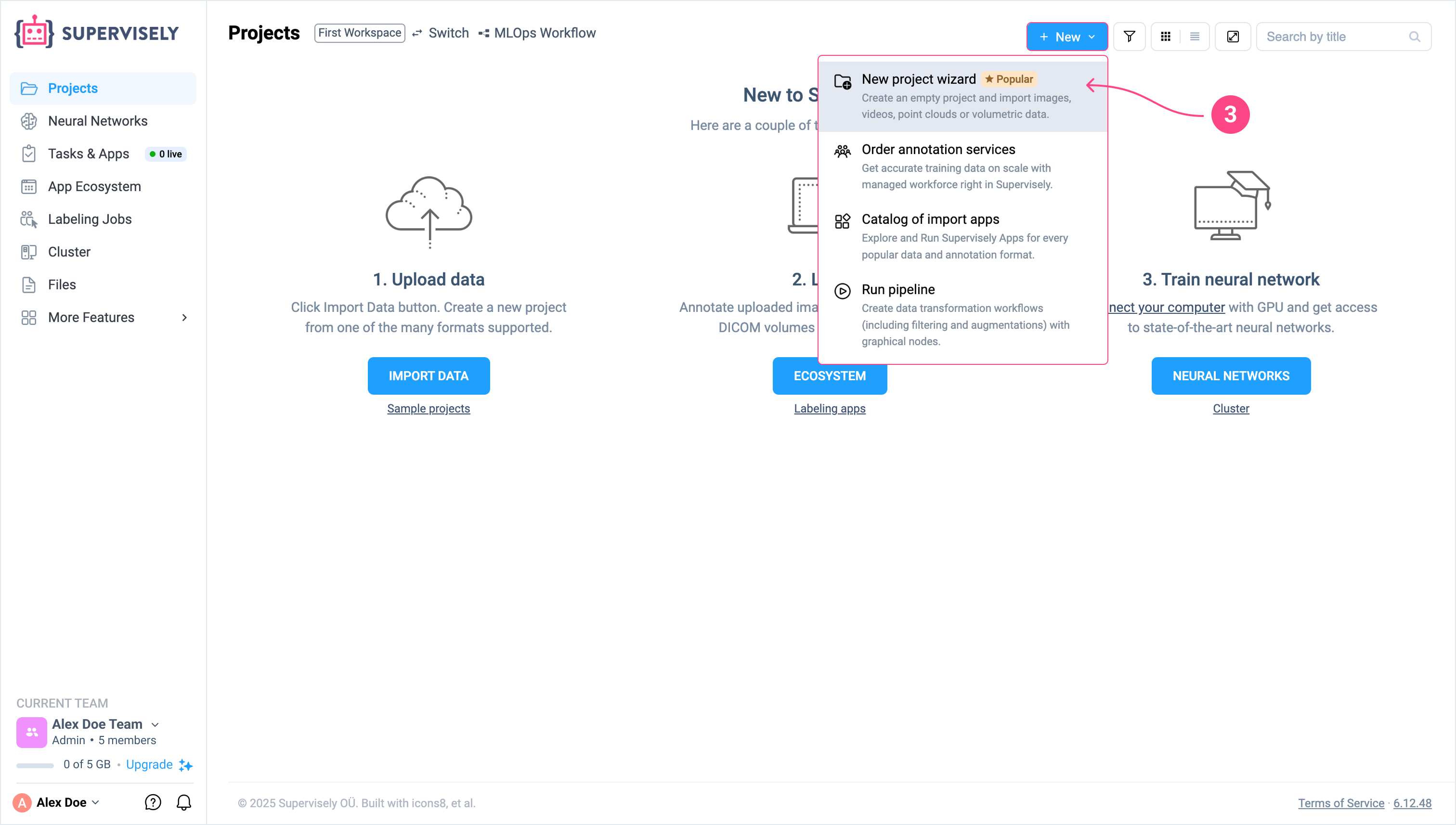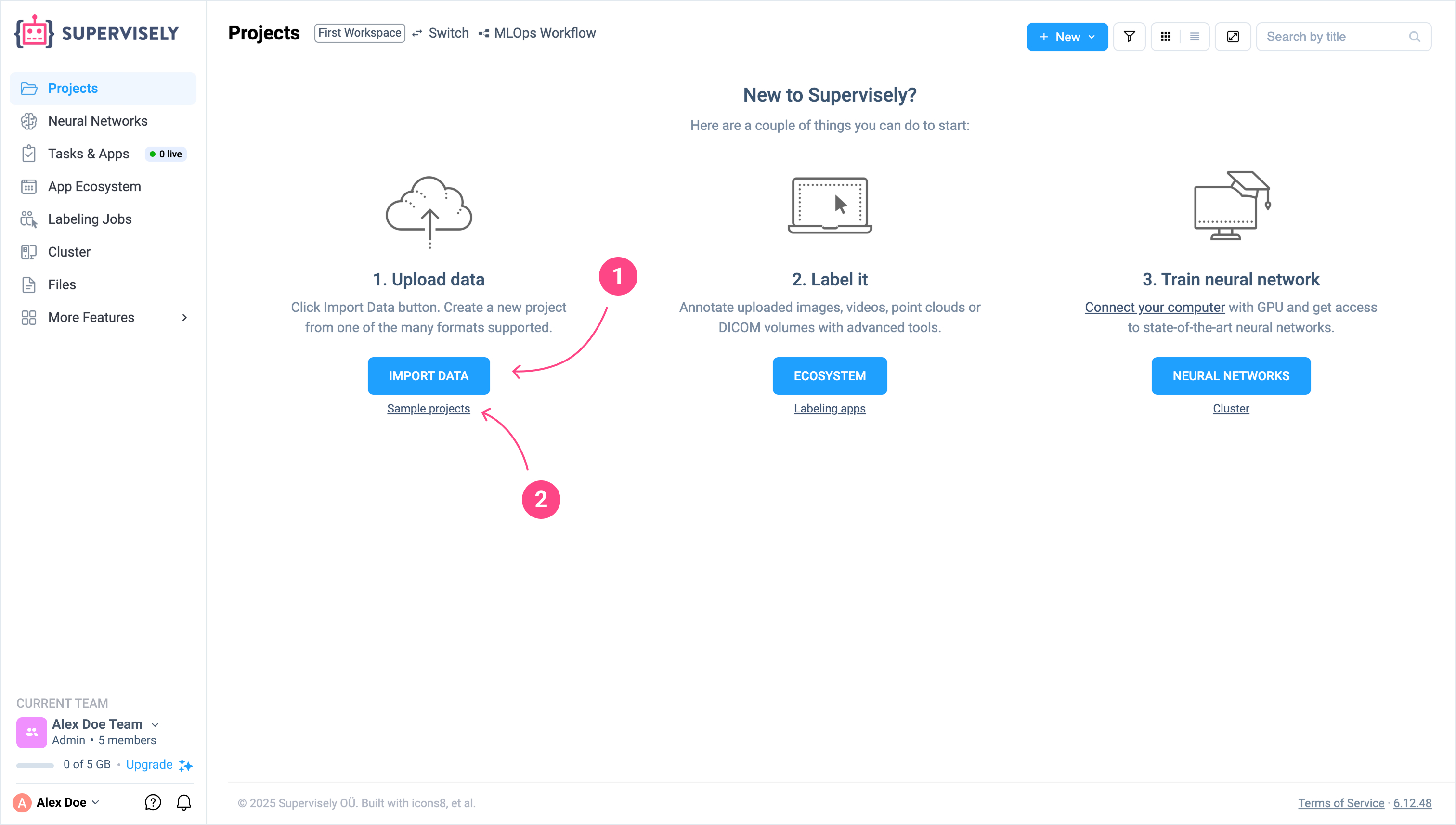 2. If you don't have any data yet, you can also upload ready-to-use sample projects to explore and learn what Supervisely has to offer.