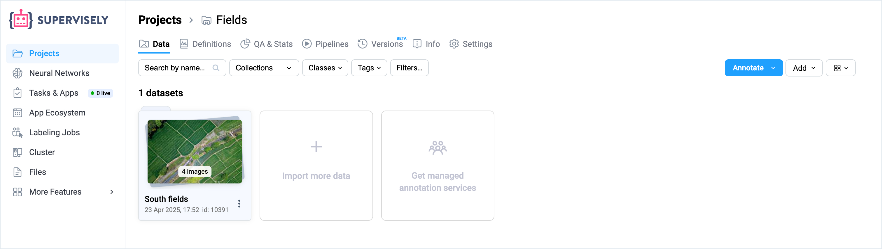 In Supervisely, a Project is a core element of the system. It is where your data and annotations are stored, and it serves as the foundation for training and evaluating models.