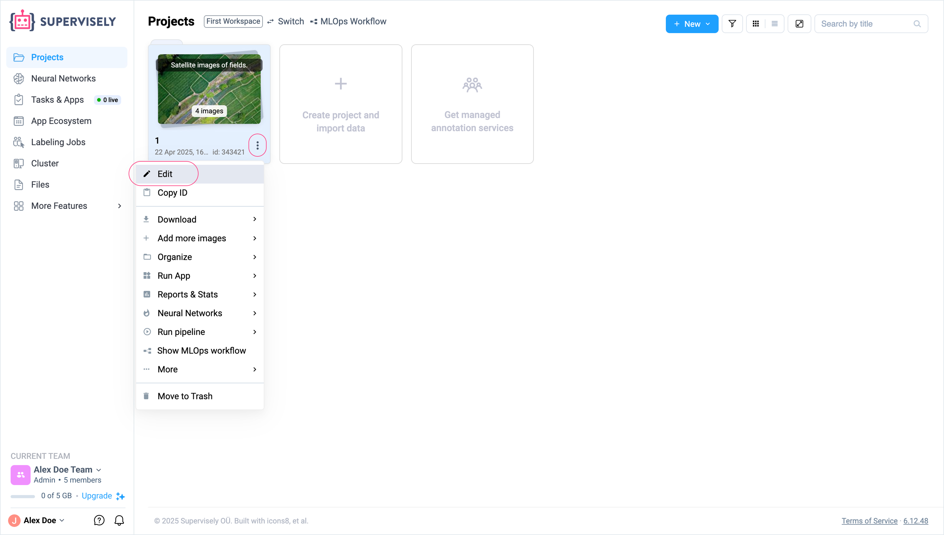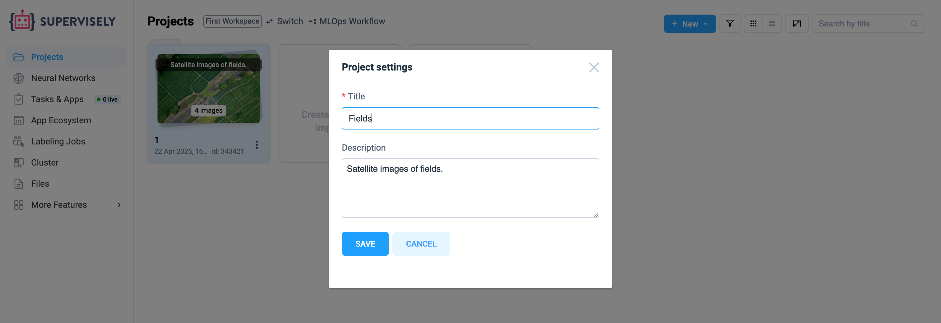 Just follow the simple steps shown in the illustrations below - you'll see how easy it is to change the **Project Name**, as well as explore other features and options available for managing your projects in Supervisely.