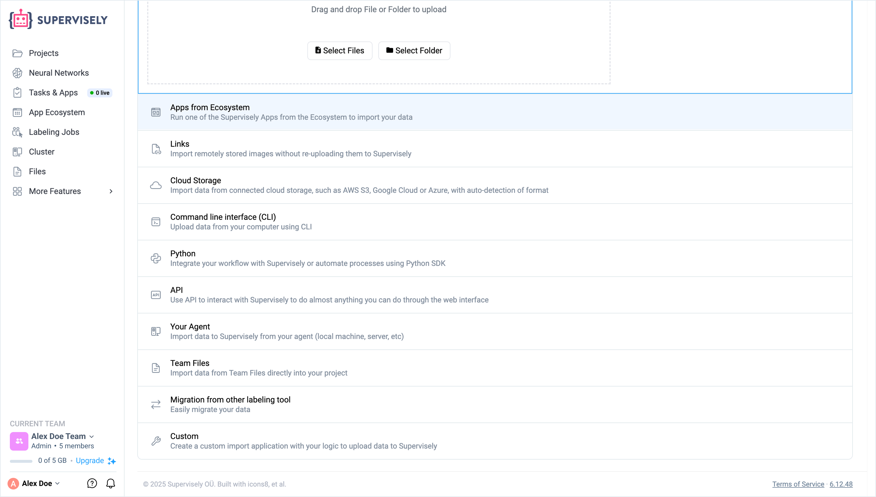Below the **Quick Auto Import** tab, you'll also find other import options, each offering different ways to bring your data into Supervisely.
