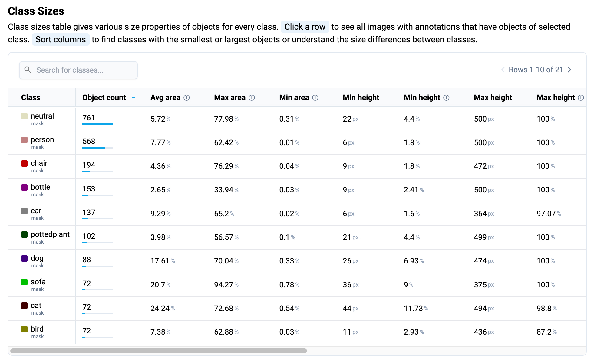 * Sortable columns enable users to identify classes with the smallest or largest objects, as well as understand size differences between classes.