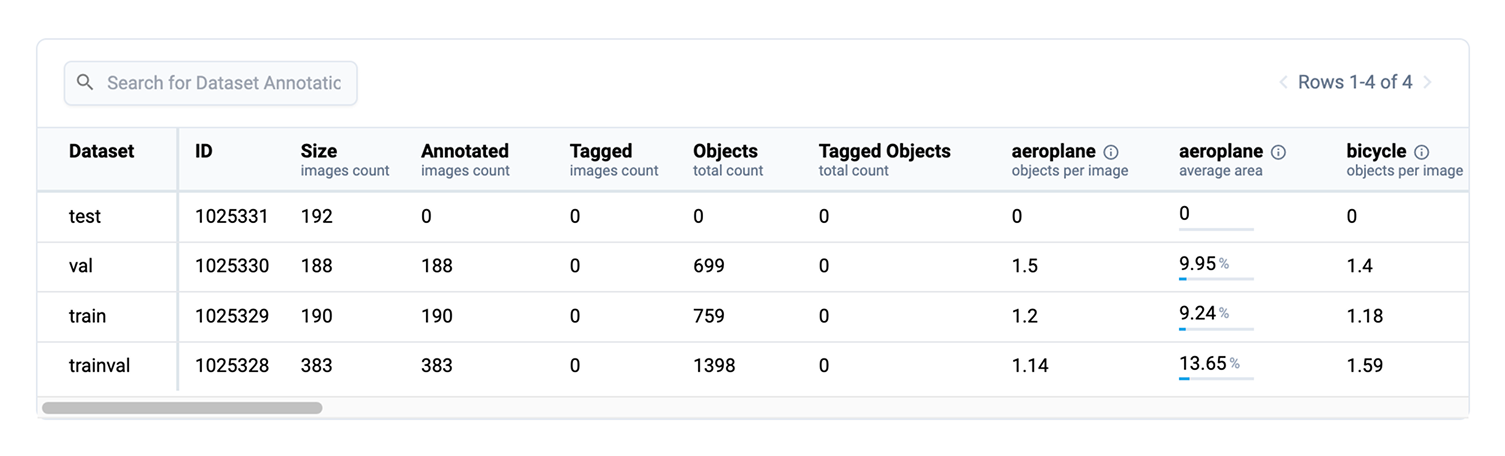 The table presents aggregated statistics per dataset, including all nested datasets. It displays average values for class area and object count per image, along with general statistics. Click a row to preview dataset images with annotations, including those from nested datasets. Sort by any column to find outliers, like unannotated datasets or datasets with abnormal average object count per image.