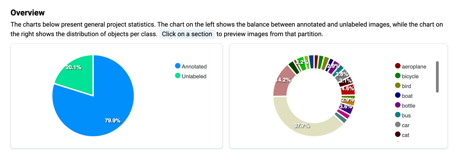 The charts below present general project statistics. The chart on the left shows the balance between annotated and unlabeled images, while the chart on the right shows the distribution of objects per class. Click on a section to preview images from that partition.