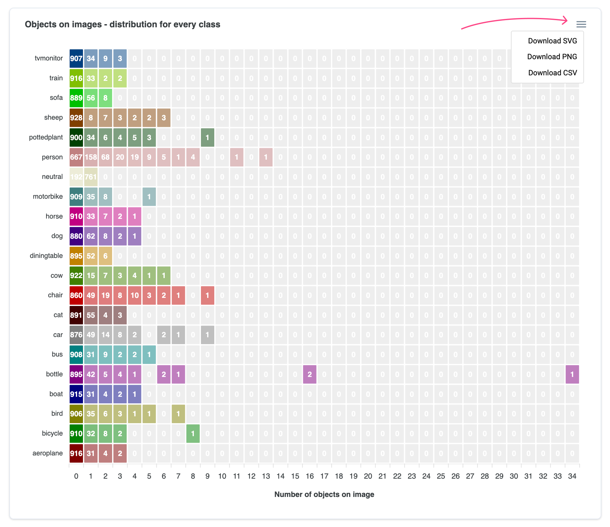 For example, let's consider the row for class `train` (Y axis) and the column 3 objects (X axis). The cell on the intersection has the value 2 which means that there are only **2 images with 3 objects of class `train` simultaneously** in our training dataset.