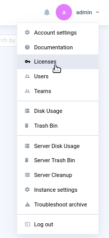 Login to your instance as the admin user and open the menu in the top right corner. Navigate to the "Licenses".