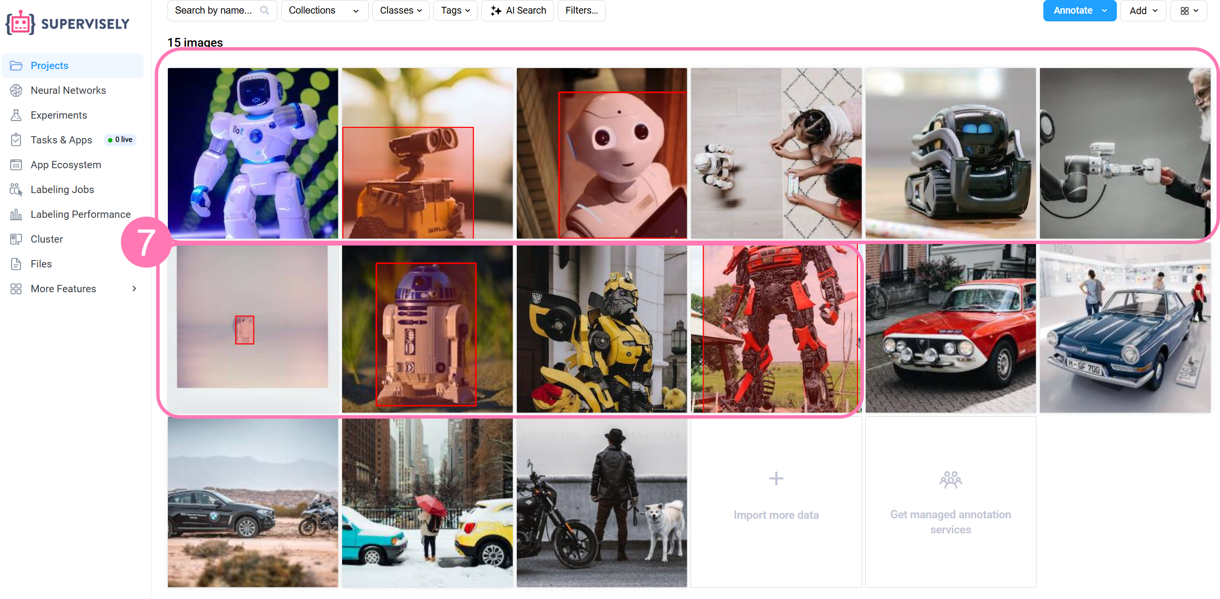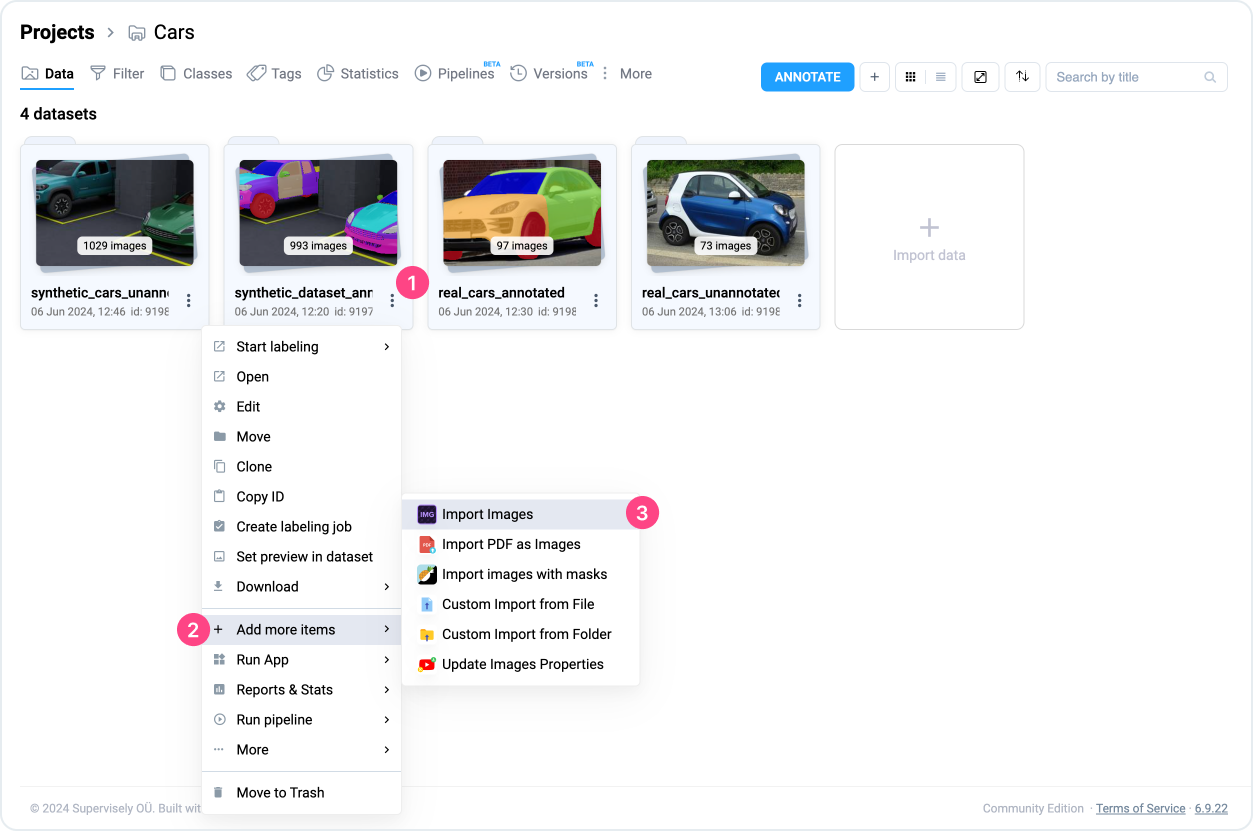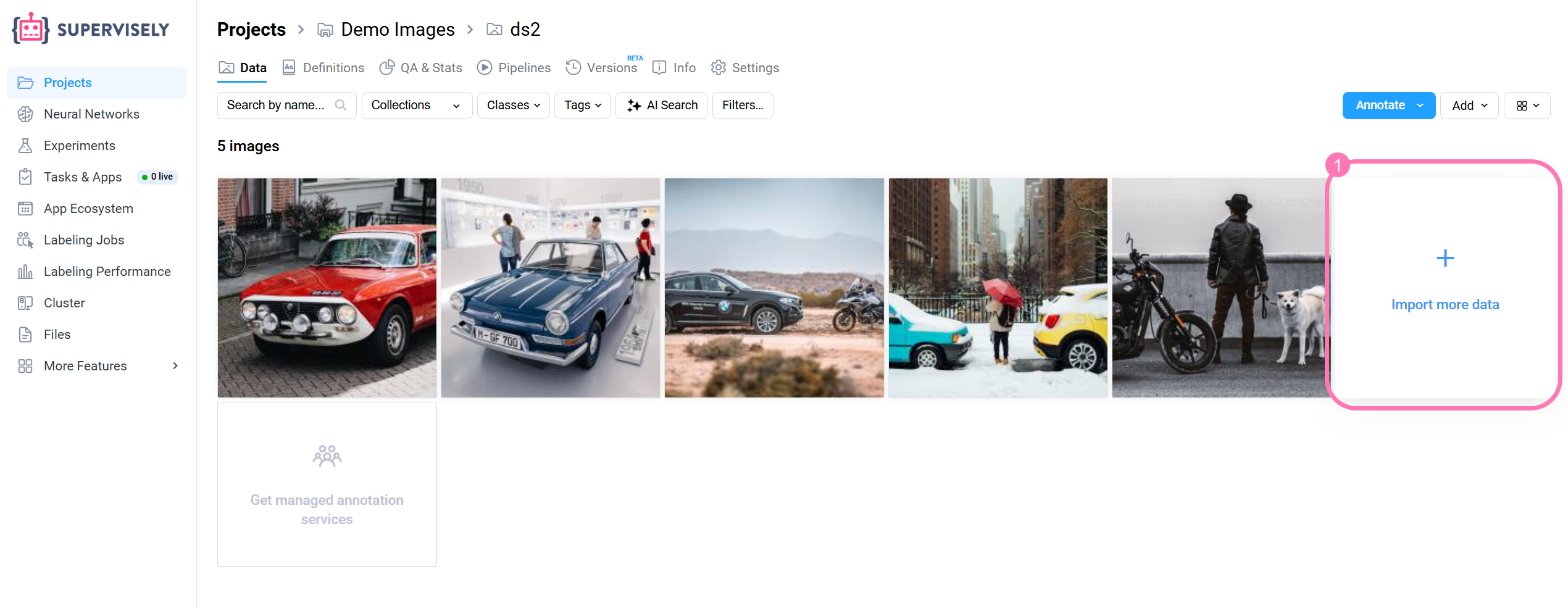 Go to the **Projects** or **Data** page, select any dataset and use the context menu by **three dots icon (⋮)** and select Add more items → Import. You find the list of [Supervisely Apps](https://app.supervisely.com/ecosystem/all-apps) that support project as an input and allow adding more content to it.