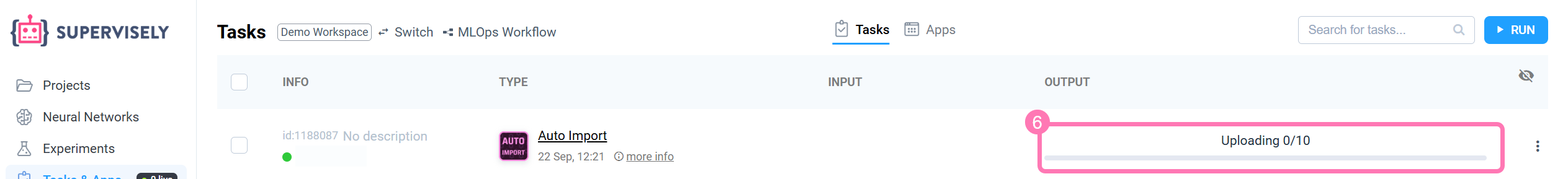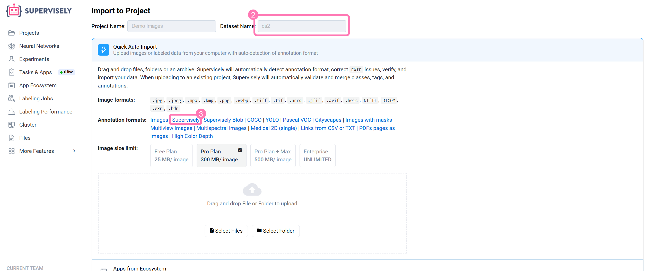 * Additionally, this page features a simplified example of the Supervisely format structure ⑤. Please double-check the data you are uploading.