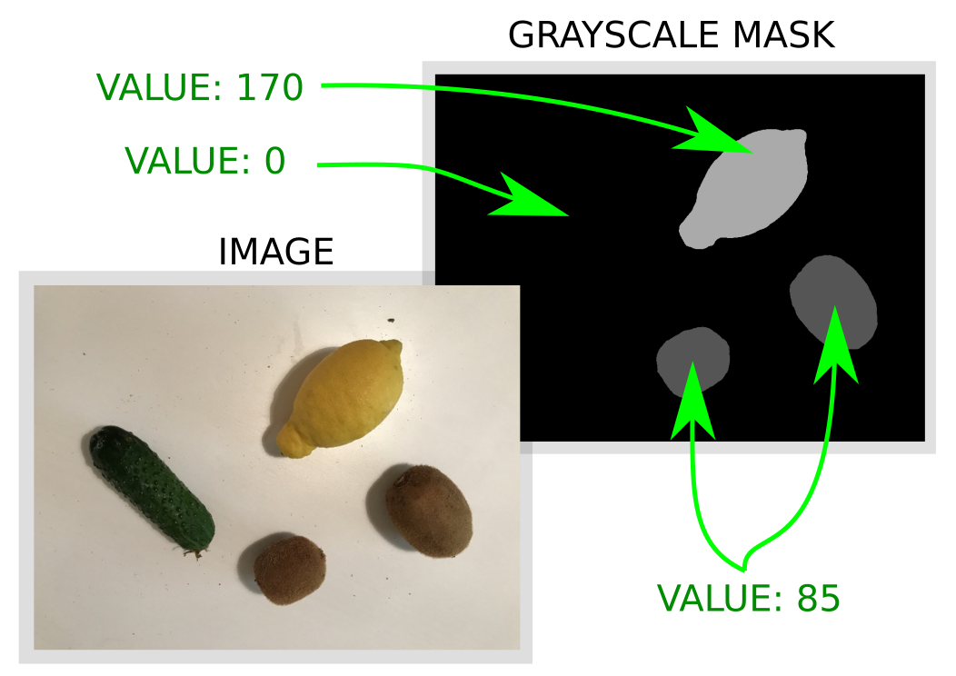 In this configuration example, all pixels in the mask with value equal to 170 will be combined in one Bitmap figure and will be assigned to the class "Lemon" and equal to 85 will be assigned to the class "Kiwi".