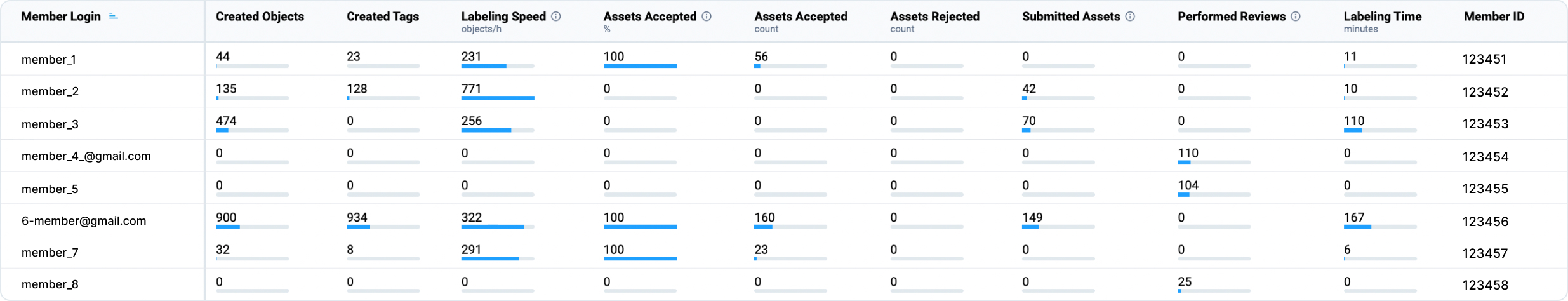 * **Member Login** - The username or email address that the team member uses to log in to Supervisely. This is the primary visible identifier for each user in the table and is used to associate performance metrics with specific team members,
