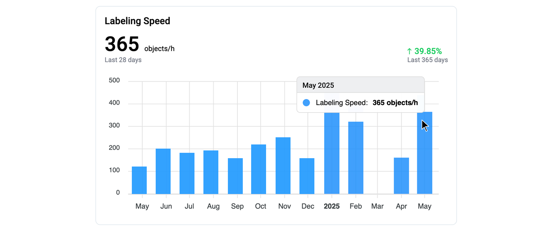 * **Labeling Speed** - The number of new objects annotated by a user per **hour of active work in the annotation interface**. “Active work” means the time when the user is creating geometries or performing other annotation actions in Labeling Jobs or queues, excluding periods of inactivity (no actions for more than 5 minutes) and time spent outside these tasks.