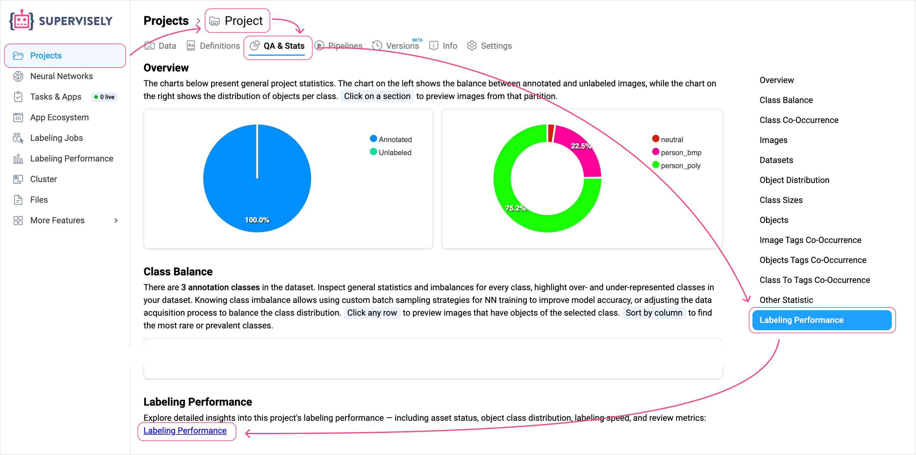 2. **From the Project Page → QA & Stats Tab** Go to a specific project page, open the **QA & Stats** tab, and click **Labeling Performance** in the navigation menu on the right. The page will scroll to the Labeling Performance section where you can click the **Labeling Performance** link. This takes you to the Labeling Performance page with the corresponding **project filter** already applied.<br>