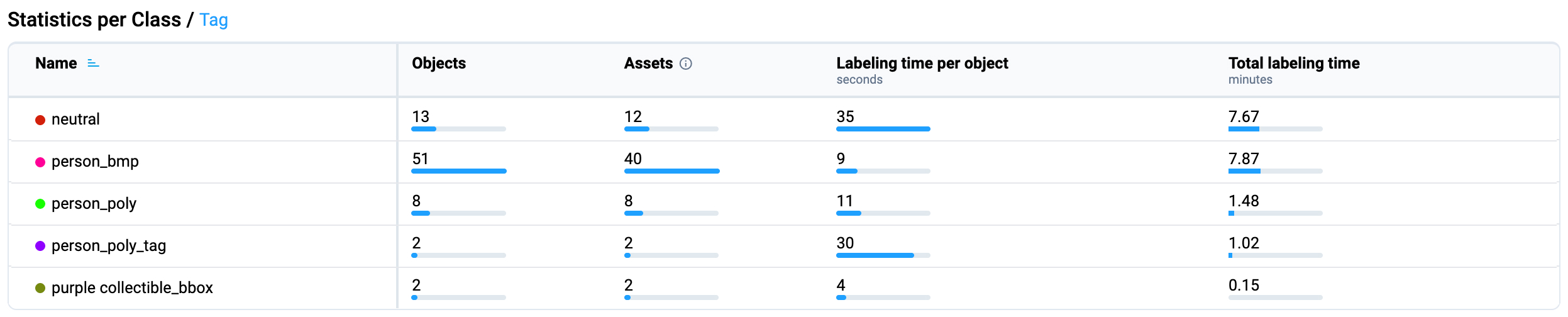 * **Total Labeling Time (minutes)** - The total time spent actively annotating objects of this class across the entire dataset. Only creation and editing of objects are included, and only during active work periods.