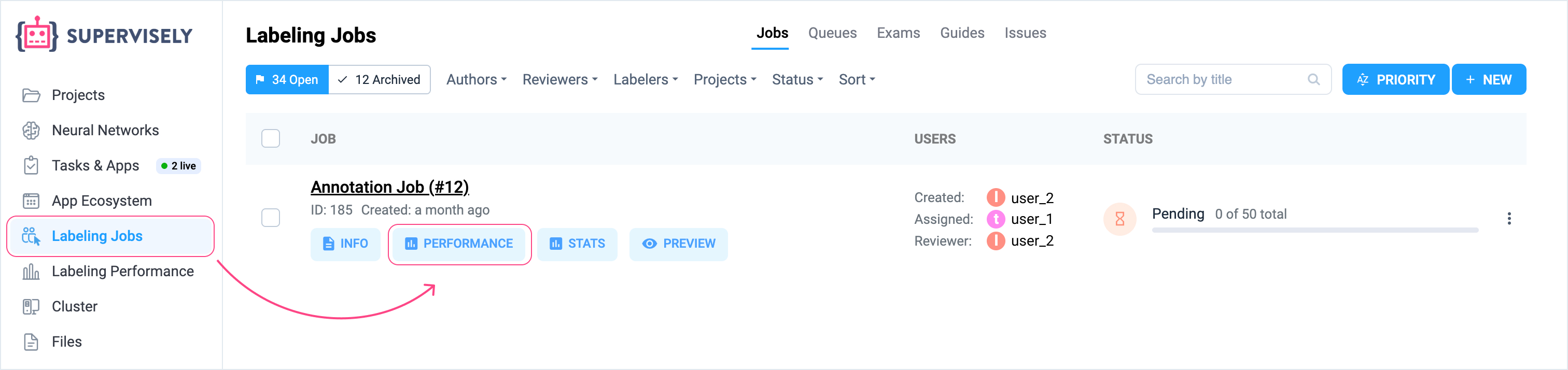 4. **From the Labeling Jobs Page** On the **Labeling Jobs** page, you'll find a **Performance** button located under each job. Clicking it will take you directly to the Labeling Performance page with the **corresponding job filter** automatically applied.<br>