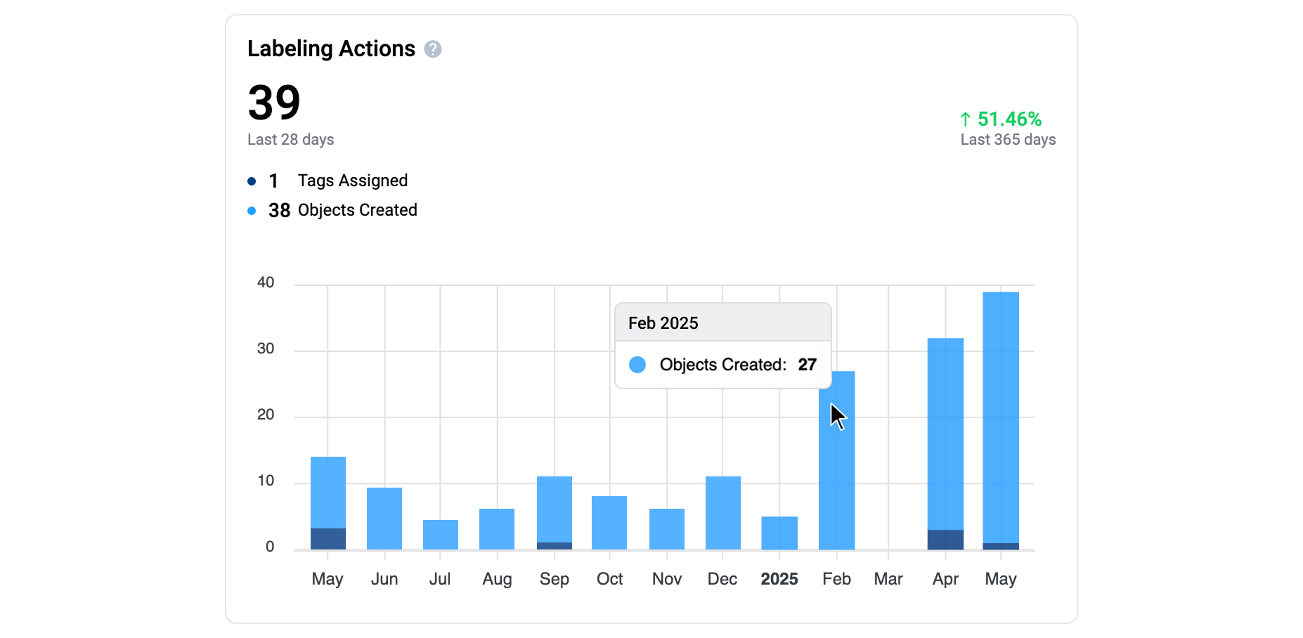 Provides insights into the volume and frequency of object creation by class over time. It helps identify peaks or gaps in annotation activity.