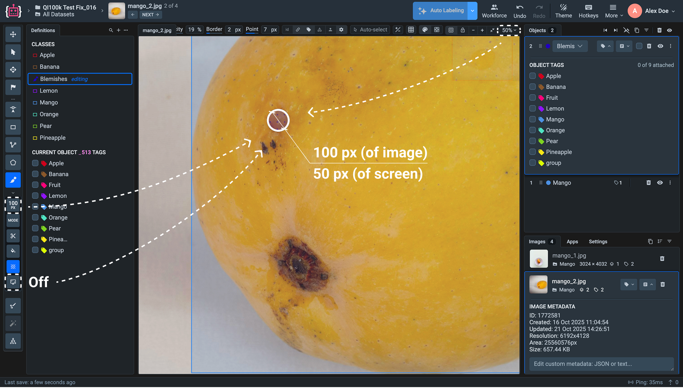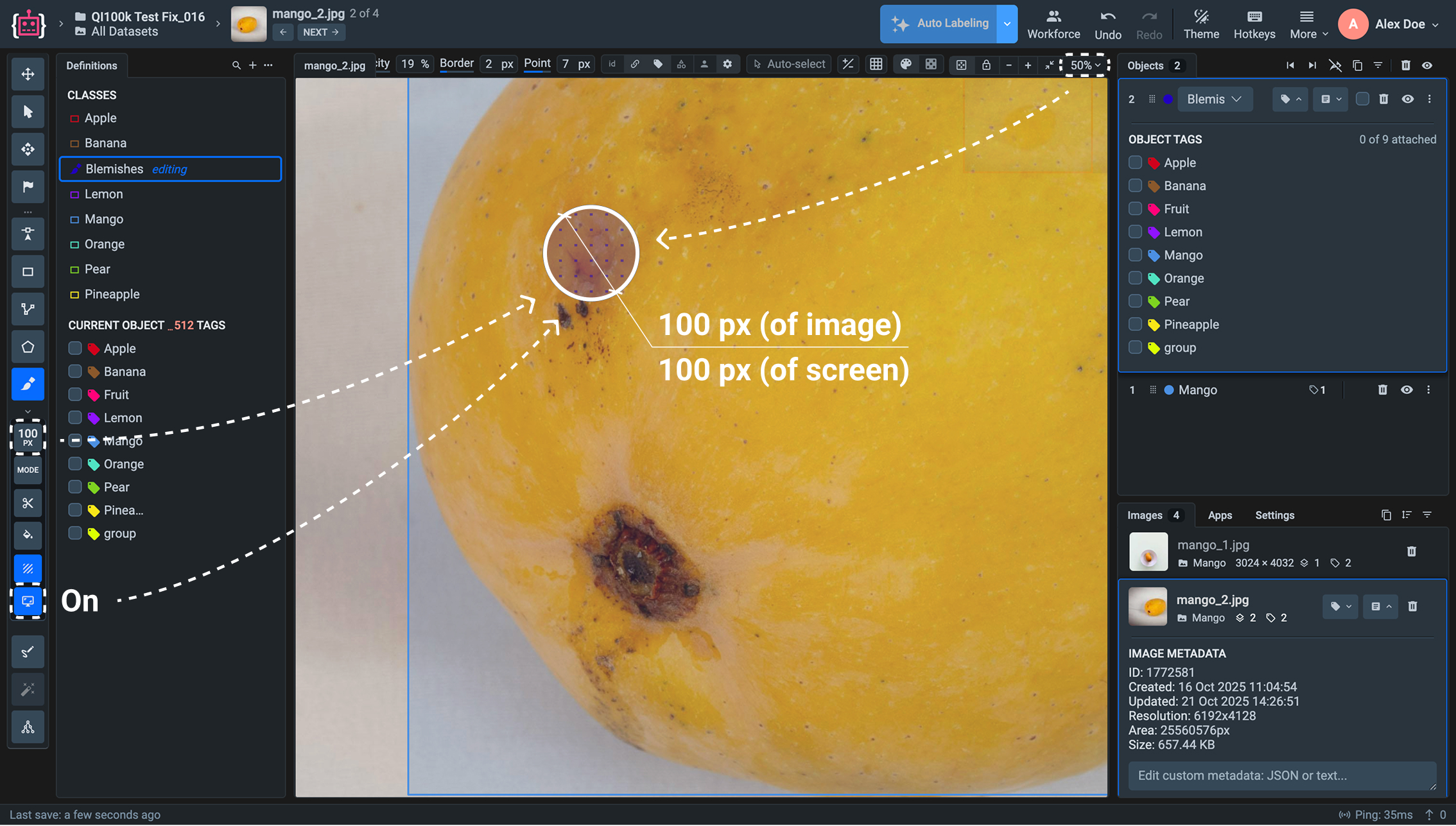 When zoom independent brush size is **enabled**, the brush diameter on the screen remains constant, regardless of the zoom level. In this mode, the cursor always represents the actual brush size defined in pixels (e.g., a 100 px brush will always appear as a 100 px circle on the screen), maintaining consistent stroke width during annotation.